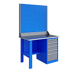 Однотумбовый. Допустимая нагрузка на столешницу 750 кг. Опорные элементы выполнены сварными из холоднокатаной стали. Верстак состоит из столешницы, опоры, тумбы P5 с четырьмя малыми и одним большим ящиком, полки-стенки, двойного экрана с кронштейнами и комплекта освещения. Все металлические элементы покрыты полиэфирной порошковой краской. Столешница из фанеры марки ФСФ толщиной 24 мм, которая покрыта лаком-антисептиком и листом оцинкованной холоднокатаной стали толщиной 1,2 мм. Размеры (ВхШхГ) 1965x1196x696 мм.