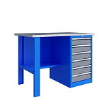 Однотумбовый. Допустимая нагрузка на столешницу 750 кг. Опорные элементы выполнены сварными из холоднокатаной стали. Верстак состоит из столешницы, опоры, тумбы P5 с четырьмя малыми и одним большим ящиком, полки-стенки и одинарного экрана с кронштейнами. Все металлические элементы покрыты полиэфирной порошковой краской. Столешница из фанеры марки ФСФ толщиной 24 мм, которая покрыта лаком-антисептиком и листом оцинкованной холоднокатаной стали толщиной 1,2 мм. Размеры (ВхШхГ) 1470x1196x696 мм.