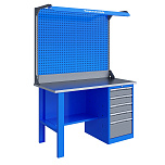 Однотумбовый. Допустимая нагрузка на столешницу 750 кг. Опорные элементы выполнены сварными из холоднокатаной стали. Верстак состоит из столешницы, опоры, тумбы P5 с четырьмя малыми и одним большим ящиком, полки-стенки и одинарного экрана с кронштейнами. Все металлические элементы покрыты полиэфирной порошковой краской. Столешница состоит из фанеры марки ФСФ толщиной 24 мм, которая покрыта лаком-антисептиком и листом оцинкованной холоднокатаной стали толщиной 1,2 мм. Размеры (ВхШхГ) 1470x1396x696 мм.
