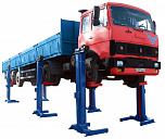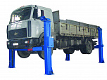 г/п. 10 тонн. Четырехстоечный. Электромеханический. Для ремонта грузовых автомобилей отечественного и импортного производства и автобусов на любой ровной площадке. Привод червячный редуктор, с концевыми выключателями нажимного действия, ограничивающими ход каретки. По отдельному заказу комплектуется установочными рамами. Поставляется в 2 вариантах Стандарт (в помещение) и ТЗ (Для эксплуатации на улице).