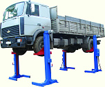 г/п. 20 тонн. Шестистоечный. Электромеханический. Для ремонта грузовых автомобилей и автобусов на любой ровной площадке. Привод червячный редуктор, с концевыми выключателями нажимного действия, ограничивающими ход каретки. Рабочие гайки повышенной прочности и износостойкости. Многоуровневая система безопасности. По отдельному заказу комплектуется установочными рамами. Поставляется в 2 вариантах Стандарт (в помещение) и ТЗ (Для эксплуатации на улице).