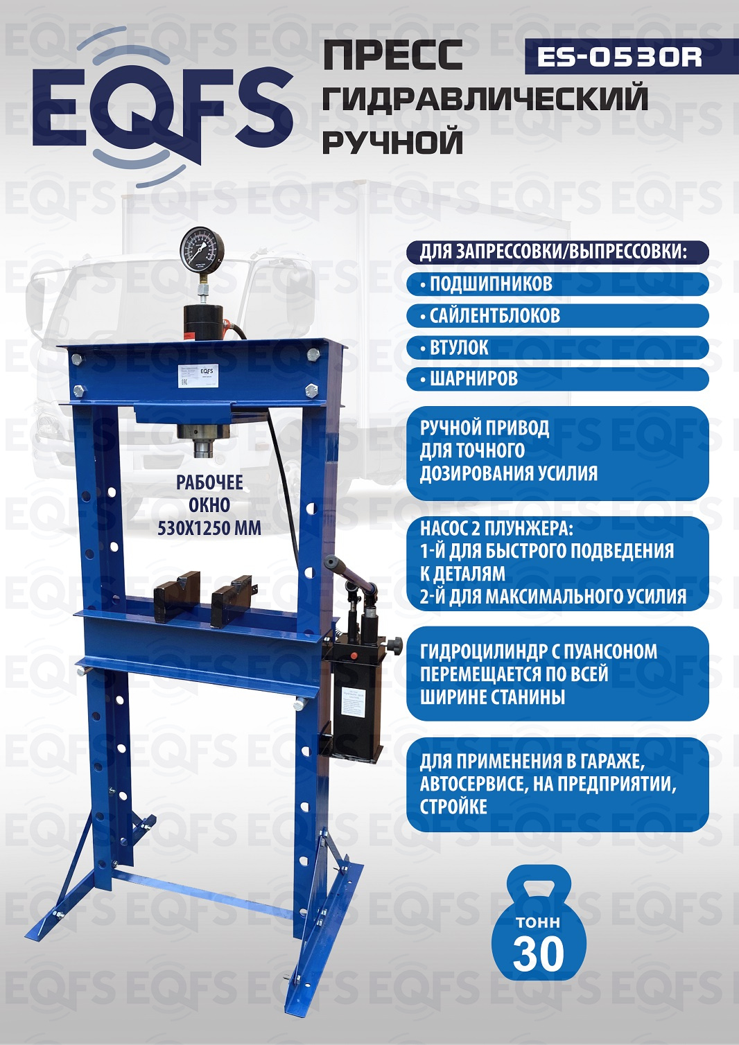 Пресс гидравлический. Ручной привод — для точного дозирования усилия ответственных деталей (подшипники). Усилие 30 тонн. Насос — 2 плунжера. Гидроцилиндр с пуансоном перемещается по всей ширине рамы. Рекомендуется для выпрессовки подшипников, деталей машин, втулок и т.п. в гараже, автосервисе, на предприятии. Рабочее окно 530х1250 мм. Доставка по РФ и ТС. Гарантия 12мес.