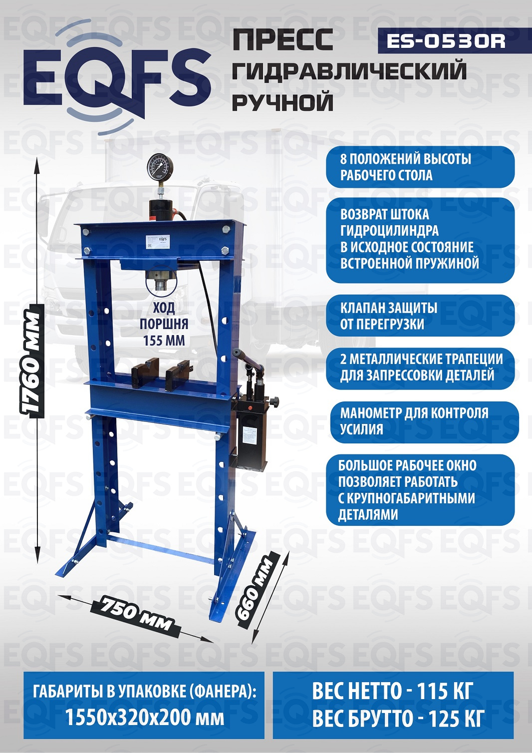 · Пресс укомплектован гидравлическим ручным насосом с максимальным усилием 30т.