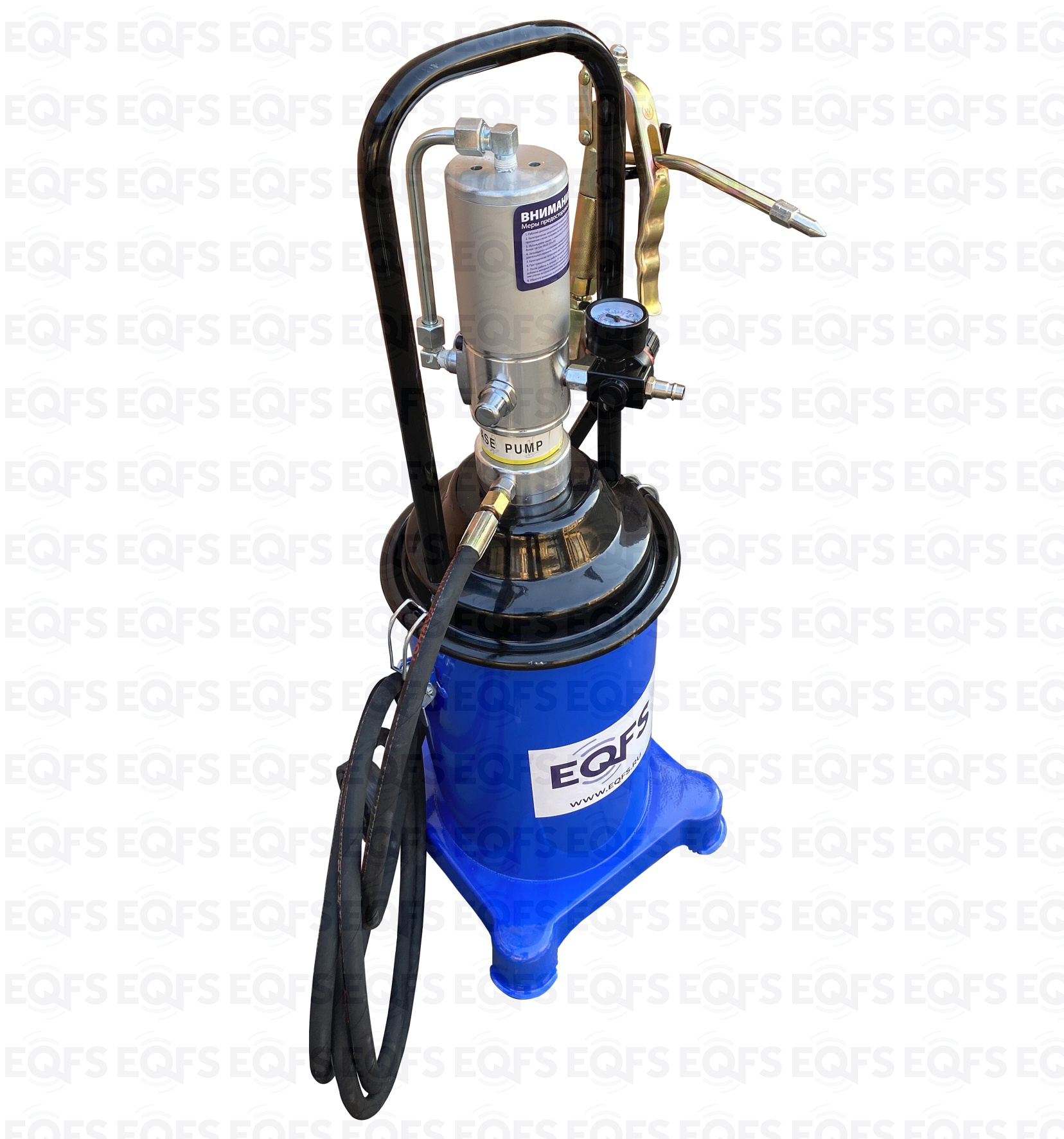 Корпус нагнетателя смазки – стальной, насос изготовлен из анодированной стали. Фиксация насоса с крышкой к баку для смазки производится с помощью металлических защелок с резьбой. Для удобства транспортировки нагнетатель оборудован металлической ручкой в верхней части корпуса. Нагнетатель оборудован маслобензостойким армированным шлангом длиной 4 м.