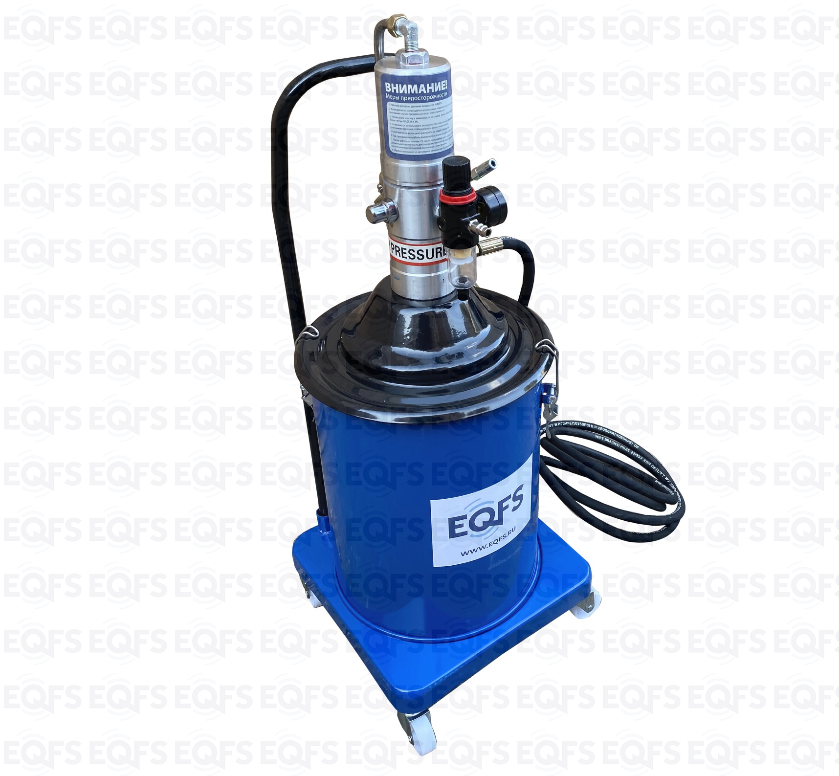 Корпус нагнетателя смазки – стальной, насос изготовлен из анодированной стали. Фиксация насоса с крышкой к баку для смазки производится с помощью металлических защелок с резьбой. Для удобства транспортировки нагнетатель оборудован металлической ручкой в верхней части корпуса. Нагнетатель оборудован маслобензостойким армированным шлангом длиной 4 м. Солидолонагнетатель для консистентной смазки, установленный на колесах, имеет легкий вес и экономичную конструкцию для удобства перемещения и эксплуатации.