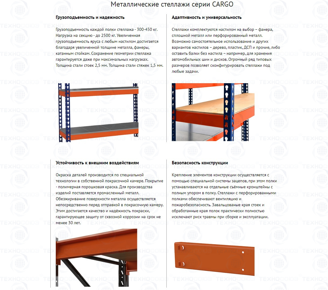 Максимальная равномерная нагрузка на ярус — до 350 кг (при использовании длинных стяжек 1820 мм на ярус нагрузка на ярус — до 300 кг). При использовании усиленных стяжек в комплекте с усилителем нагрузка на ярус — до 450 кг для металлического настила и до 350 кг для фанерного настила. Максимальная нагрузка на секцию: до 2500 кг.