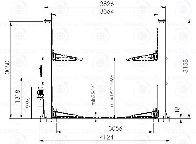 Симметричный двухстоечный автосервисный подъемник с нижней синхронизацией  грузоподъемность 6,0 т. с ручными / электрическими стопорами. Предназначен для подъема коммерческих автомобилей, бронированных автомобилей, автомобилей с длиной базой типа Мерседес Спринтер, Пежо Боксер и т.п.при комплектации удлиненными лапами 940-1800мм.