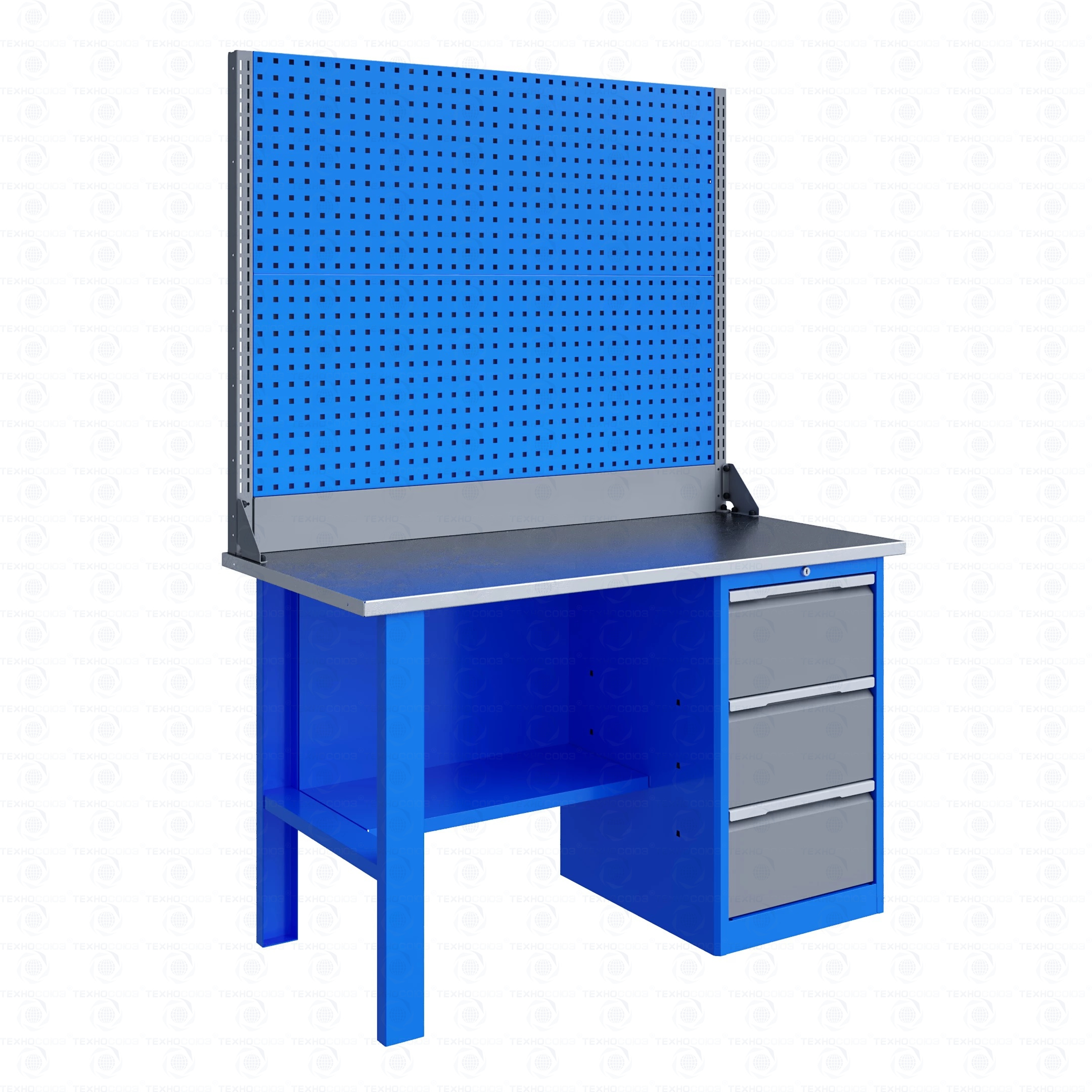Однотумбовый. Допустимая нагрузка на столешницу 750 кг. Опорные элементы выполнены сварными из холоднокатаной стали. Верстак состоит из столешницы,опоры, тумбы P3 с тремя большими ящикам, полки-стенки, двойного экрана с кронштейнами. Столешница состоит из фанеры марки ФСФ толщиной 24 мм, которая покрыта лаком-антисептиком и листом оцинкованной холоднокатаной стали толщиной 1,2 мм. Размеры (ВхШхГ) 1965x1396x696 мм.